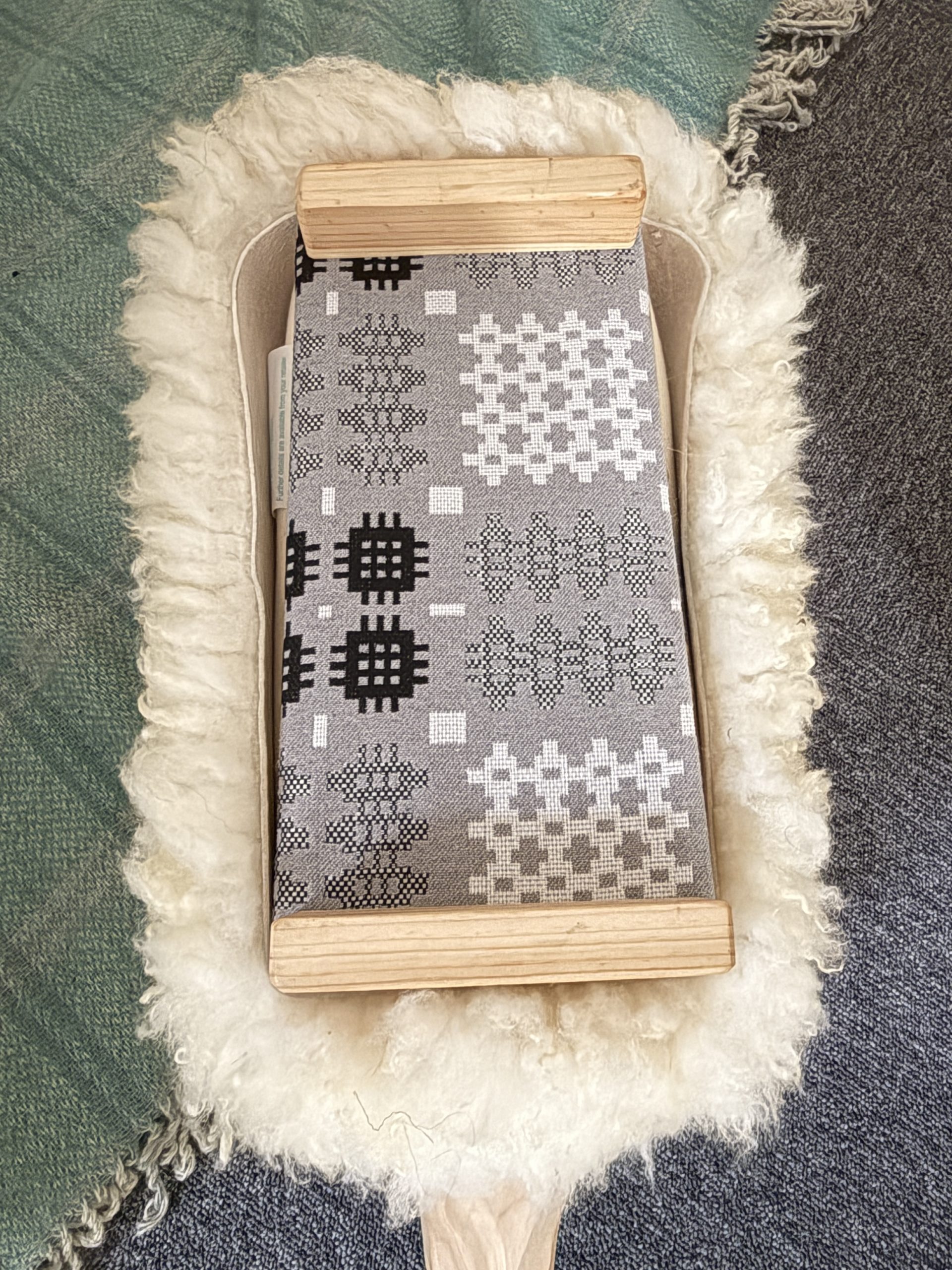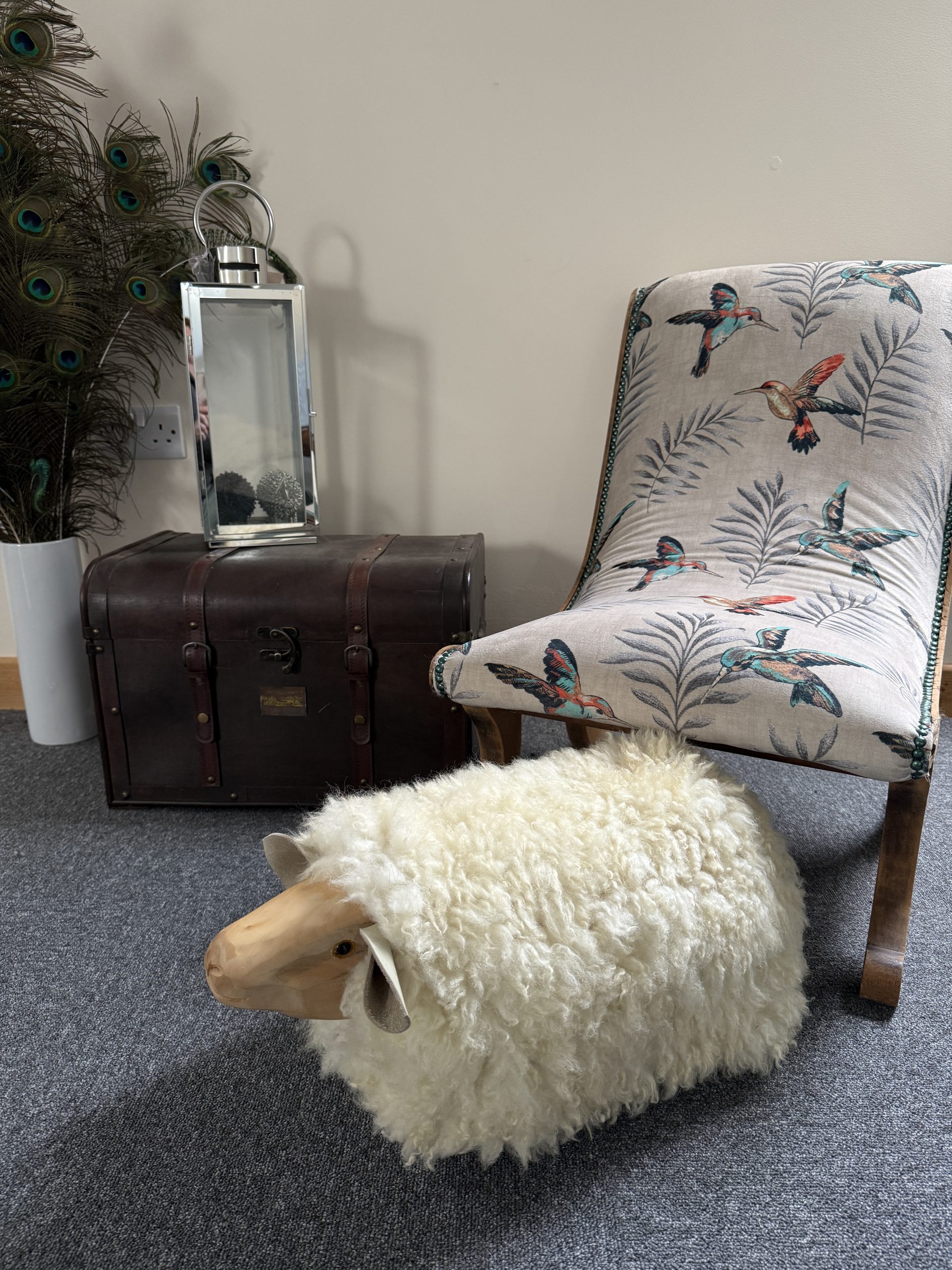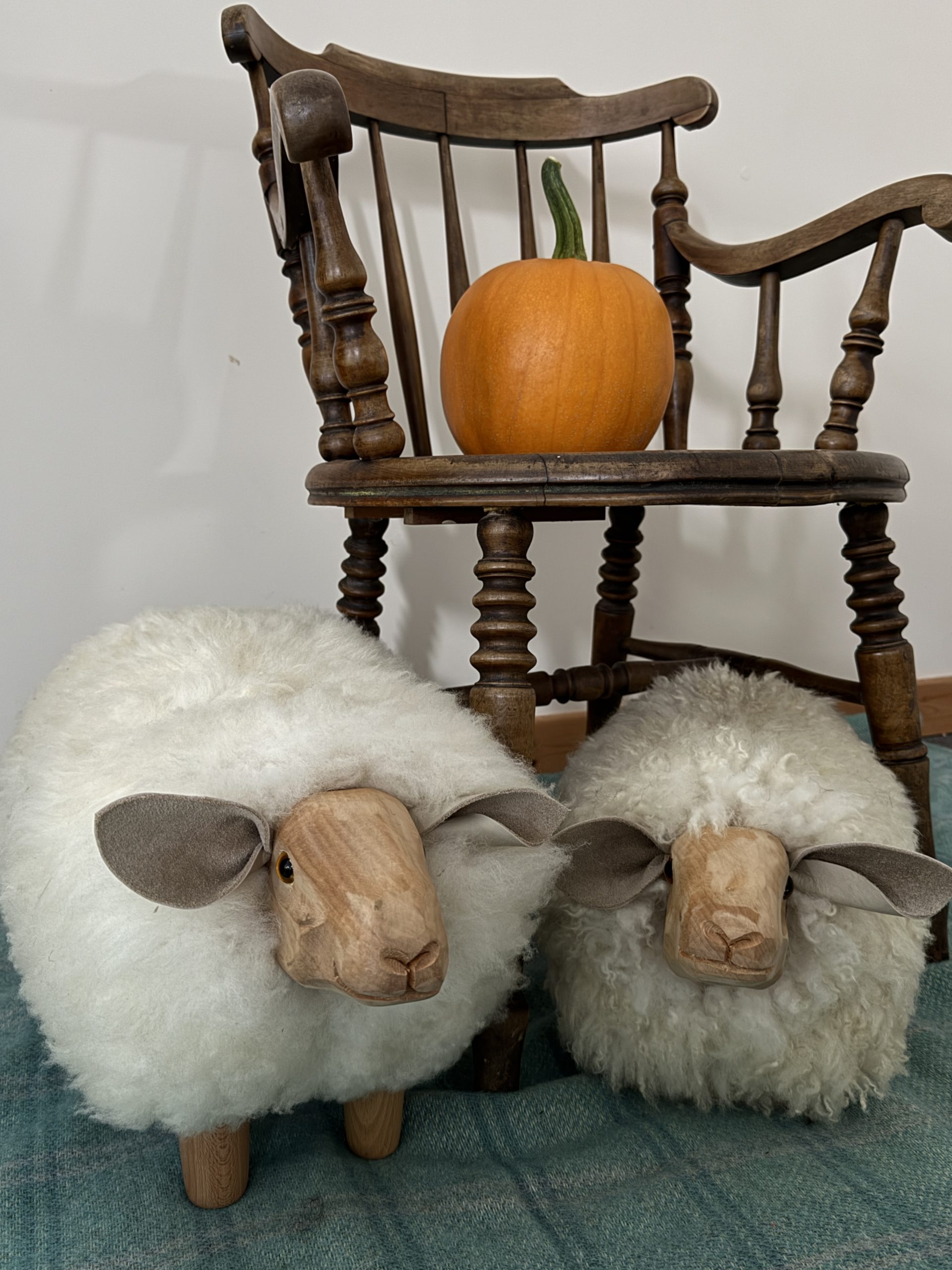 This luxurious individual footstool has been hand carved and built by Liz Mangles, Ewenique Furniture, she creates a range of wonderfully quirky but practical and sturdy sheep-shaped footstools. They are hand-made and combine realistically carved heads with our organically tanned sheepskin coats from our own mixed breed flock, as well as the added touch of using welsh blanket style fabric underneath each footstool.